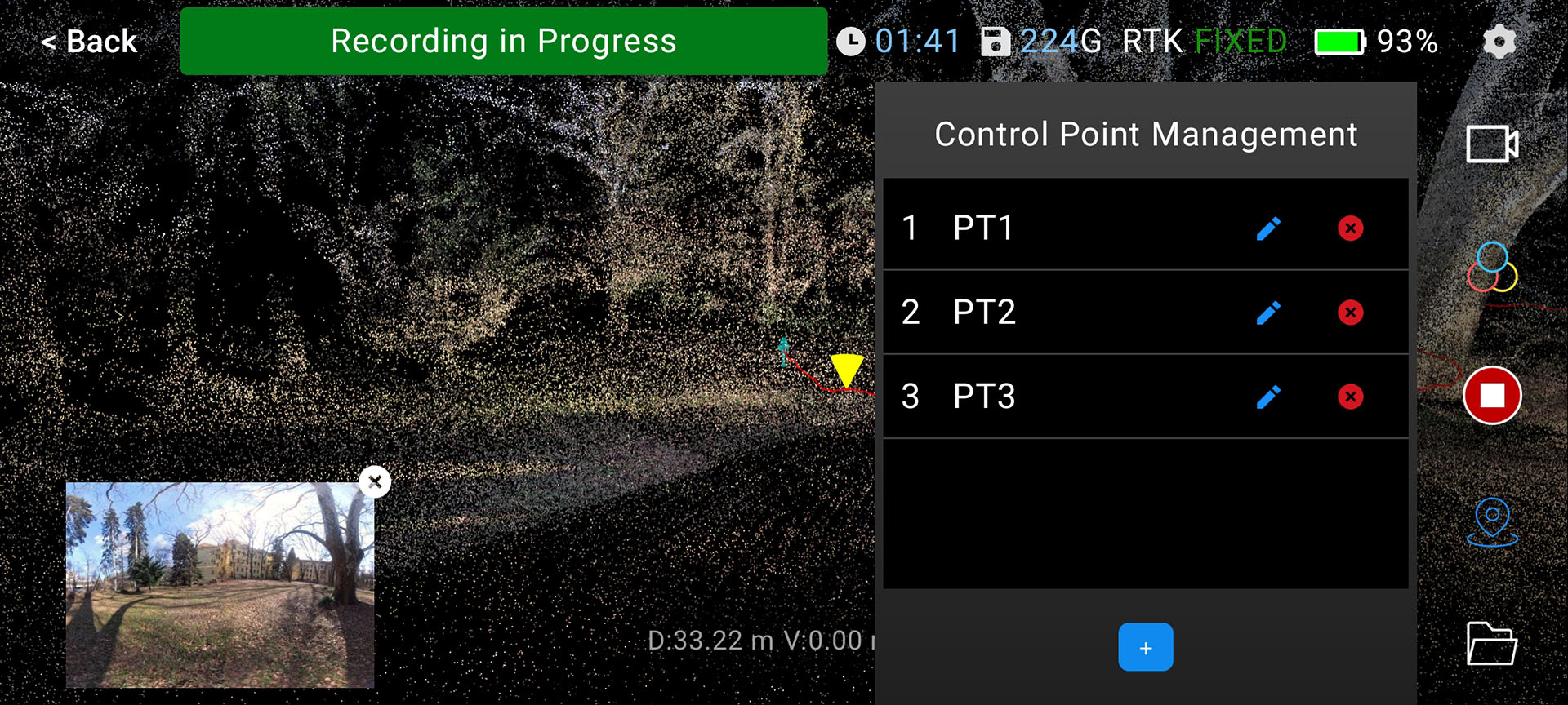 Az Android eszközökre telepíthető Share Capture alkalmazás vezérli az egygombos műszert. Az alkalmazásba bejelentkezés után kapcsolódhatunk Bluetooth-on keresztül a műszerhez. A beállításokban létrehozhatunk RTK accountokat, megadhatjuk az NTRIP kiszolgálóval kapcsolatos adatokat (szerver, jelszó, port, mount point). Sikeres kapcsolódás után hamar látjuk a GNSS pozíciót, műhold számot és a RTK állapotot. Lombtalan állapotú bükkösben ez 10 másodpercen belül FIX, sűrűbb lucosban is 30 másodpercen belül létrejött. RTK beállítás után indíthatjuk a mérést. Mérés közben földi kontrollpontokat (GCP) kell hozzáadnunk, ez egy képernyőgomb megnyomásával lehetséges. Egy projekthez minimum 3 pont szükséges. Érdemes akkor gyűjteni a GCP-ket, amikor RTK Fix státusz van. Sikeres volt eddig minden georeferálás, amikor a GCP-k nagy része Fix módban mért.