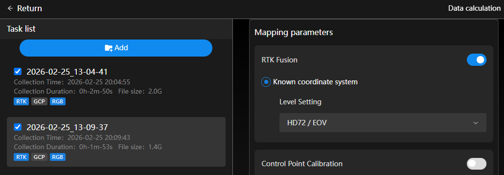 A mérési állományt a számítógépre kell mentenünk. A Share Point Cloud Studiojával fel kell dolgoznunk. Az alkalmazás ingyen letölthető. A feldolgozáshoz célszerű egy 64GB RAM-os, többmagos és dedikált videókártyával rendelkező gépet használni. Kisebb projektek, mintapontok, vonalas felvételek kisebb kapacitású számítógépen is feldolgozhatók. A feldolgozáshoz létre kell hoznunk egy új projektet, egy célkönyvtárat, majd hozzá kell adni a terepi mérési állományokat. Csoportosan beállítható az RTK Fusion és a célvetület (HD72/EOV). Ezután a Start Calculation minden hozzáadott állományt feldolgoz és georeferál. A kimeneti könyvtárba kerülnek a SLAM algoritmussal összetájékozott és georeferált, LAS formátumú pontállományok, egy színezet és egy nem színezett. A feldolgozásról LOG fájlokat készít.